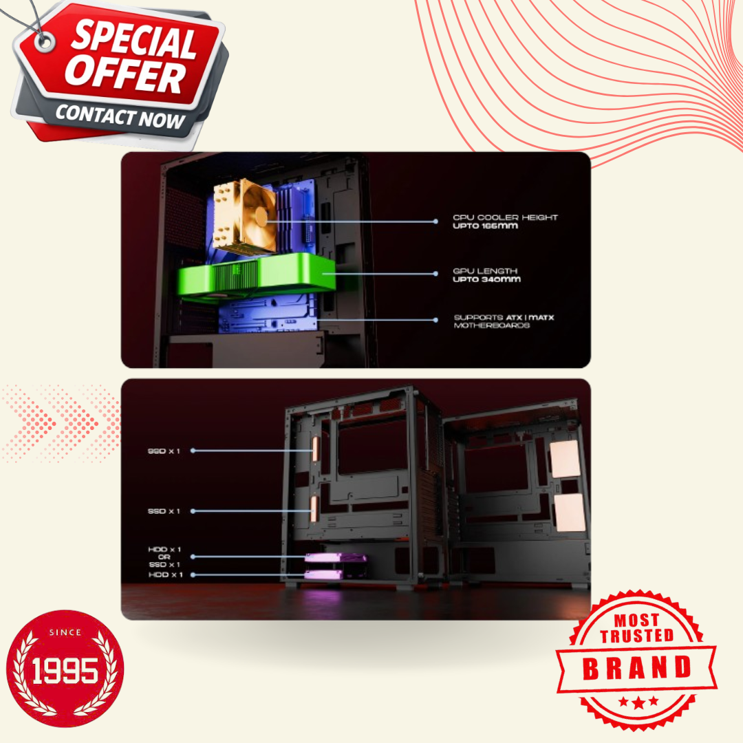 Ample Space: It easily accommodates graphics cards up to 340mm in length and CPU air coolers up to 165mm in height.
