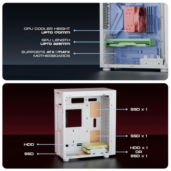 GPU: up to 325mm | CPU cooler: up to 170mm