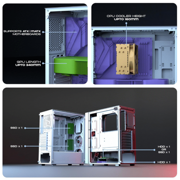GPU clearance up to 340mm | CPU cooler height up to 165mm
