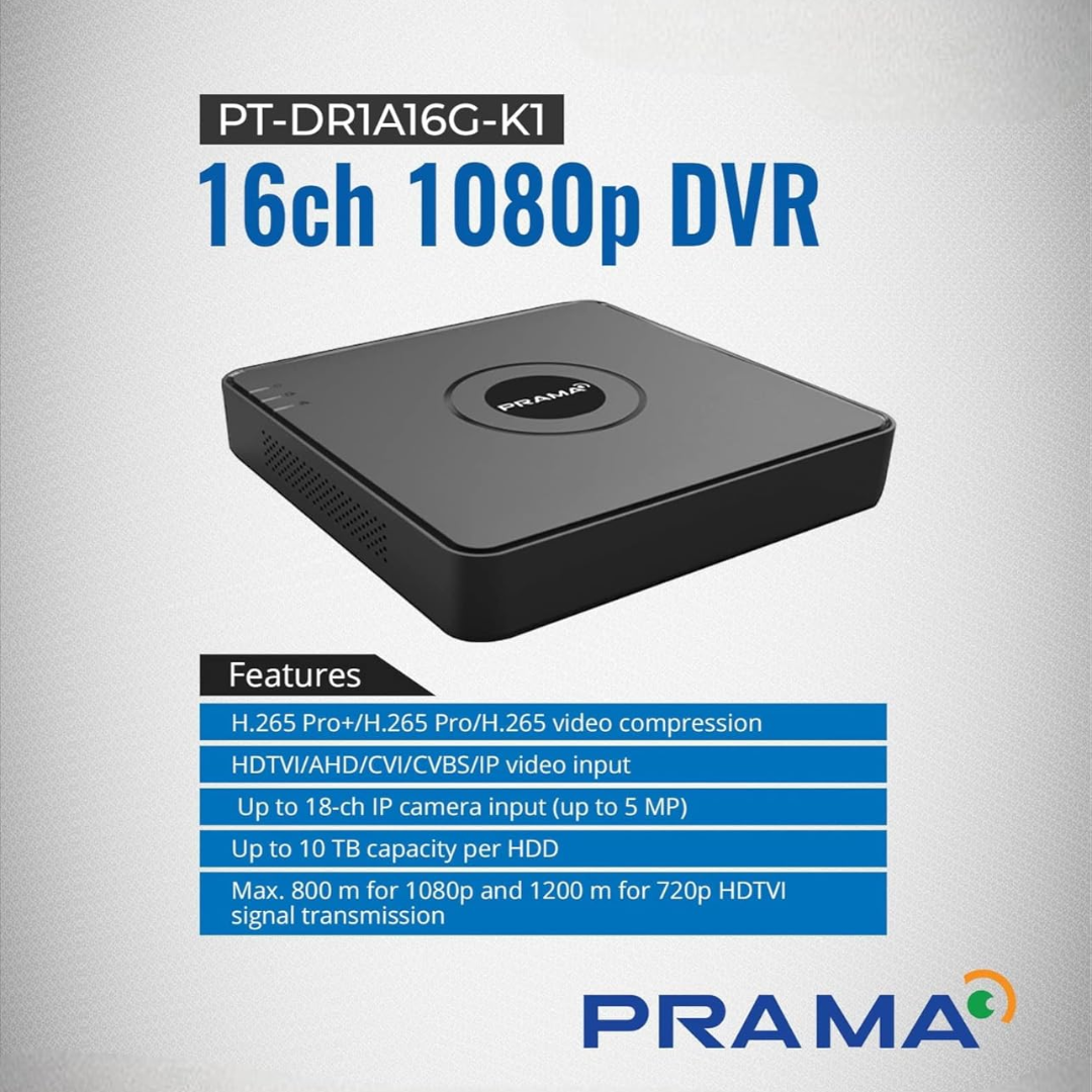 The PRAMA PT-DR1A16G-K1 16 Channel DVR offers powerful and reliable video recording for up to 2MP CCTV cameras. With advanced H.265 Pro+/H.265 Pro/H.265 compression, it provides superior video quality while saving storage space. Supporting up to 18 IP camera inputs (up to 5MP), this DVR is ideal for both home and business surveillance setups. Comes complete with a USEWELL HDMI cable for seamless installation and connectivity.